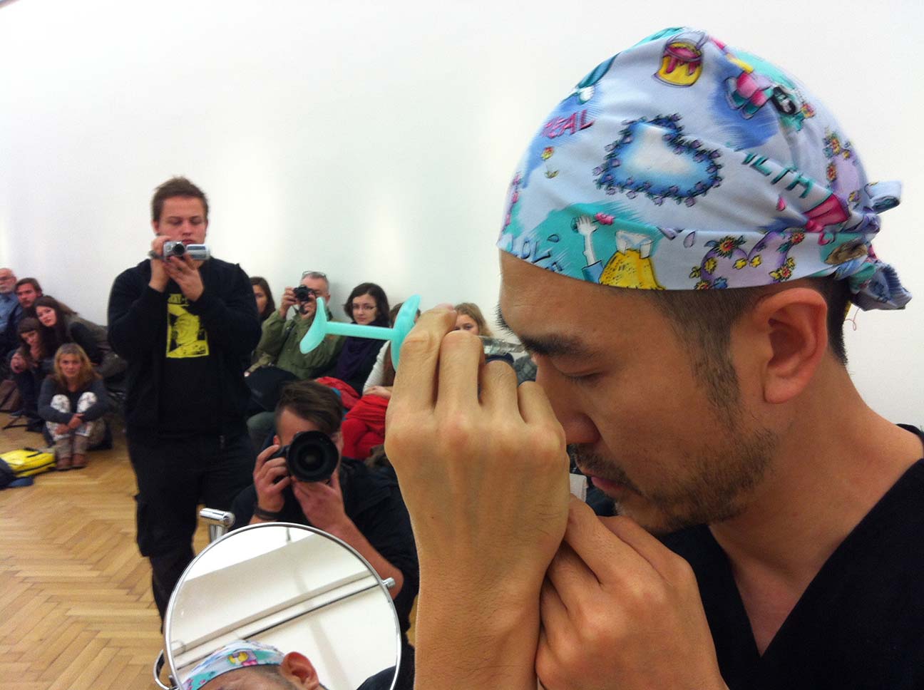 提到有关身体的行为艺术,很多人的第一反应是觉得偏激、极端,甚至疯狂。为表达对人性的思考对人体进行夸张的表现从而达到刺激的艺术表现效果本无可厚非,只是近一二年来,有一些在视觉上比较刺激的行为艺术作品被冠上了病态、血腥、暴力等称谓,这在社会上也引起了很多争议。但韩啸的行为艺术却自始至终与上述描绘无关,虽然几乎每次个展都与身体有关,但无一例外地带给观者完美精致的视觉享受。此次给自己注射玻尿酸也不例外,整个过程无出血、无病态,艺术家的每一个动作都给人以优雅的感觉,令人不禁赞叹其手术技法之精妙。