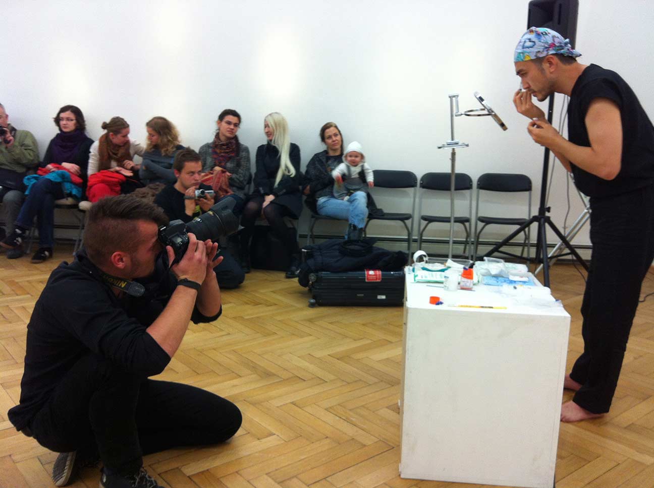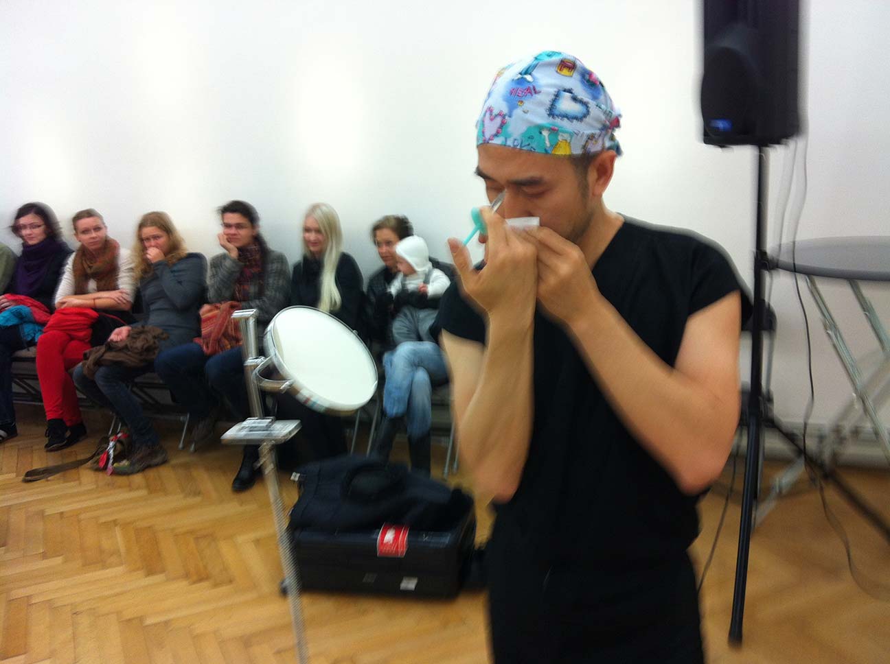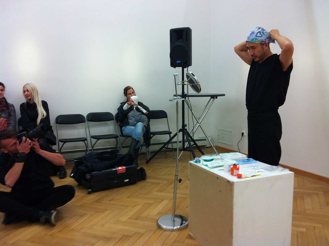 作为捷克行为艺术节开场表演之一(另两个分别为波兰Mal-gorzata的“三条线”和捷克艺术家Martin的“体验”),韩啸在《吉—属于自己的身体》 中上演开运整形—给自己注射玻尿酸。捷克国家美术馆展览现场布置简洁,仅有一张小桌、一面特制的镜子、注射用玻尿酸等器械。四周坐满了观众,许多欧洲行为大师也前来观展。韩啸走进大厅,首先用流利的英文讲述了自己如何从一个整形医生转做当代艺术,并向观众讲解了本次作品的背景及缘由。解说完毕,韩啸从容地脱下外衣,着无袖黑色手术衣,扎一条头巾。场内一片肃静,人们睁大眼睛盯着他看,多台相机和摄像将他层层围住,也有人在担心他有没有身体保险。当韩啸把针直扎进他的鼻梁上时,人们惊呆了,许多人为他揪心紧张,全场一片寂静,而艺术家韩啸却从容地操作着。十几分钟后,注射完成,整个过程无出血无创伤。韩啸表情轻松地向媒体朋友挥手示意,自信自制的精彩表演博得全场热烈的掌声。好奇的人跑上前观察,行为大师Milan更是抢先对着他整形后的脸拍照。