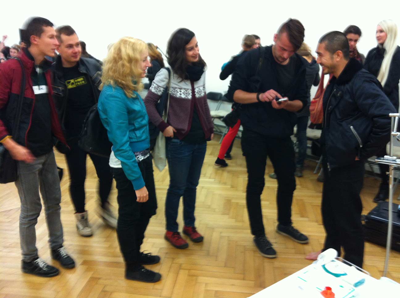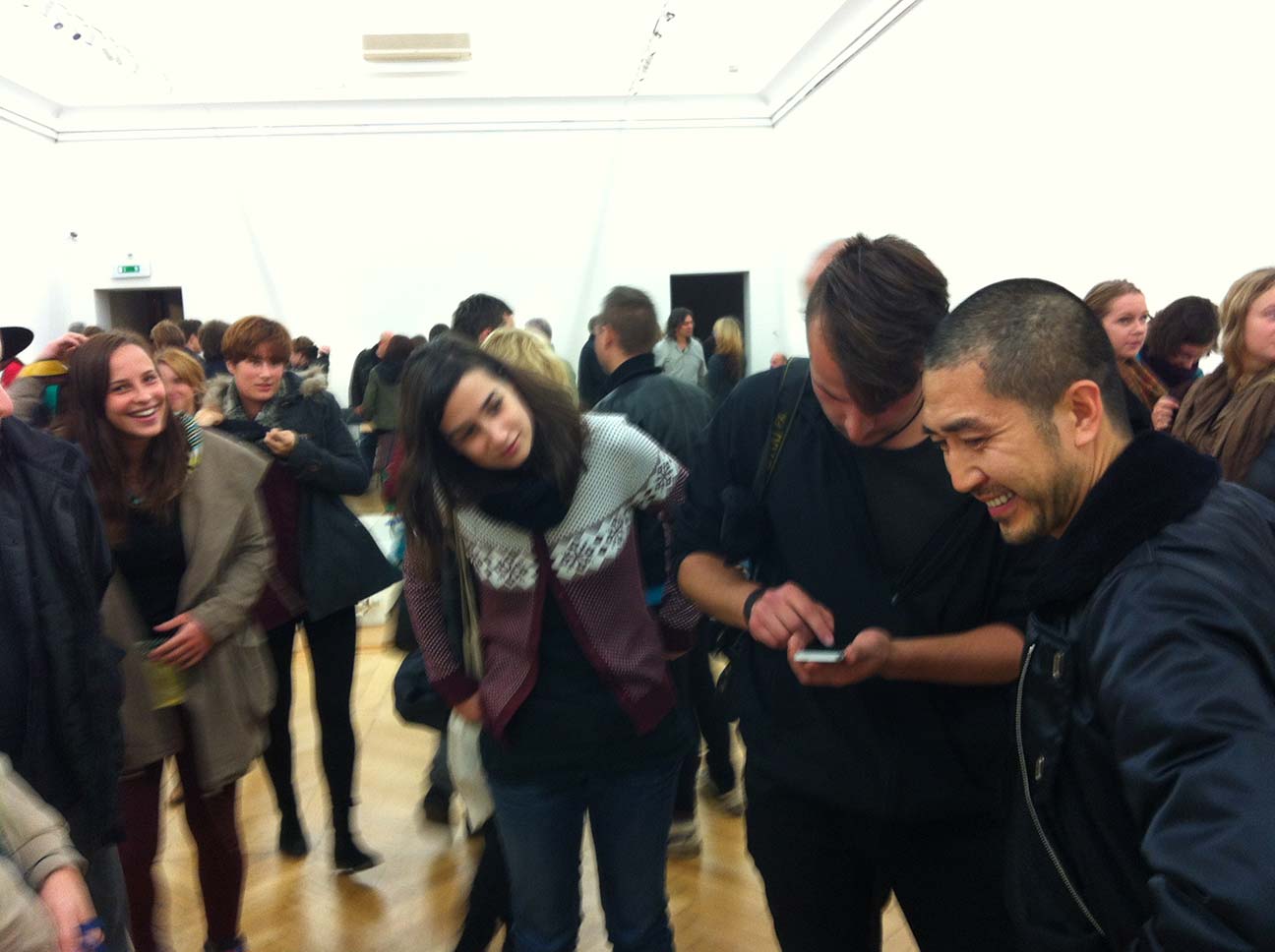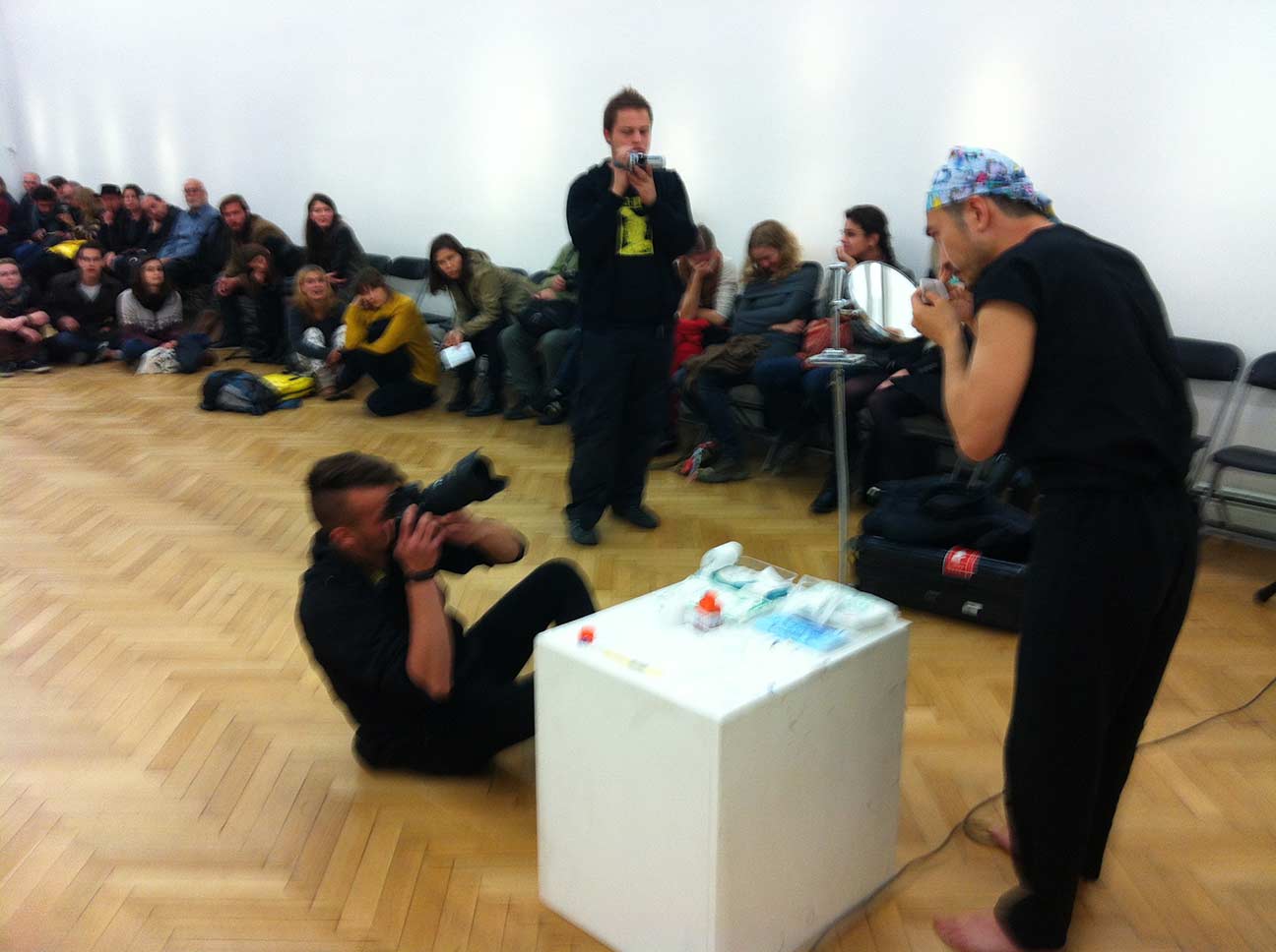 作为捷克行为艺术节开场表演之一(另两个分别为波兰Mal-gorzata的“三条线”和捷克艺术家Martin的“体验”),韩啸在《吉—属于自己的身体》 中上演开运整形—给自己注射玻尿酸。捷克国家美术馆展览现场布置简洁,仅有一张小桌、一面特制的镜子、注射用玻尿酸等器械。四周坐满了观众,许多欧洲行为大师也前来观展。韩啸走进大厅,首先用流利的英文讲述了自己如何从一个整形医生转做当代艺术,并向观众讲解了本次作品的背景及缘由。解说完毕,韩啸从容地脱下外衣,着无袖黑色手术衣,扎一条头巾。场内一片肃静,人们睁大眼睛盯着他看,多台相机和摄像将他层层围住,也有人在担心他有没有身体保险。当韩啸把针直扎进他的鼻梁上时,人们惊呆了,许多人为他揪心紧张,全场一片寂静,而艺术家韩啸却从容地操作着。十几分钟后,注射完成,整个过程无出血无创伤。韩啸表情轻松地向媒体朋友挥手示意,自信自制的精彩表演博得全场热烈的掌声。好奇的人跑上前观察,行为大师Milan更是抢先对着他整形后的脸拍照。